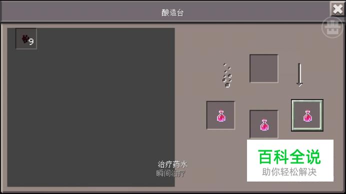 酿造好粗制的药水后,我们还需要将闪烁的西瓜放在药水瓶上面的格子中,这样便可以将其酿造成初级治疗药水了,如下图所示,制作好的治疗药水是粉色的。
