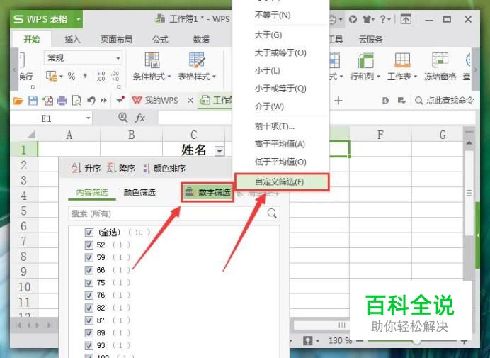 在新弹出的筛选对话框中选择“数字筛选”,然后在其子菜单中点击“自定义筛选”,点击确认,如图所示: