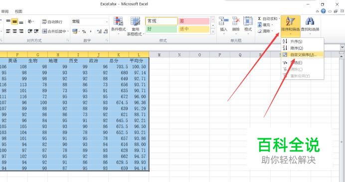 选中后,在开始选项卡 编辑选项组 中找到 排序和筛选,点击里面的“自定义排序”。