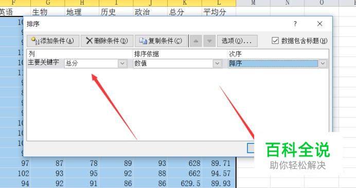 在弹出的自定义排序对话框中,选择你要排序的参数,比如:以总分降序排序,点击确定。