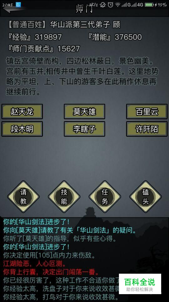 作为初入华山派的弟子我们先要拜师,我们在师门主页面的老师是足够我们武功学到300级的,也就是说我们在武学300级以前都是不用着急。