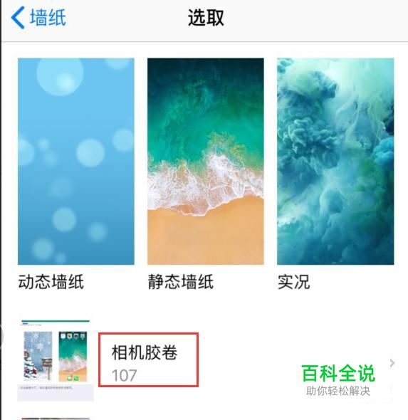 进入墙纸设置后,我们可以看到iPhone已经设置了锁定屏幕以及主屏幕,点击进入“选取新的墙纸”,进入选取页面,点击进入“相机胶卷”页面,选定刚才下载的图片,