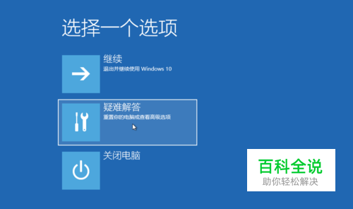 2、重复上述操作2到3次,直到出现“选择一个选项”界面“,点击“疑难解答”;