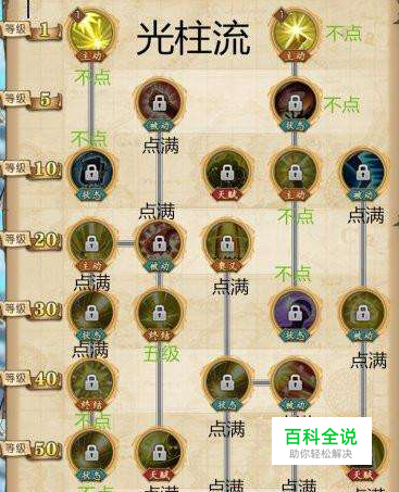 第四横排20级技能,三个全满,暴击强化和八尺镜不用说。光柱这个技能很强,别看基础伤害不算特别高,但是,这是一个十字范围的AOE伤害,也就是说,如果对面站位给面子,一个光柱打四个人,而且光柱技能还有第五横排的附加伤害。
