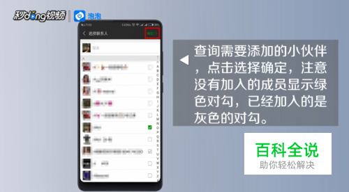 查询需要添加的小伙伴,点击选择确定,注意没有加入的成员显示绿色对勾,已经加入的是灰色的对勾。