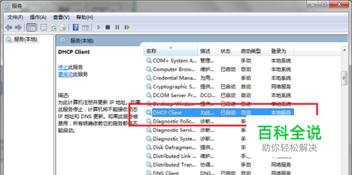 第二步进去系统服务之后,在列表中找到DHCP Client服务,双击进去,如下图所示: