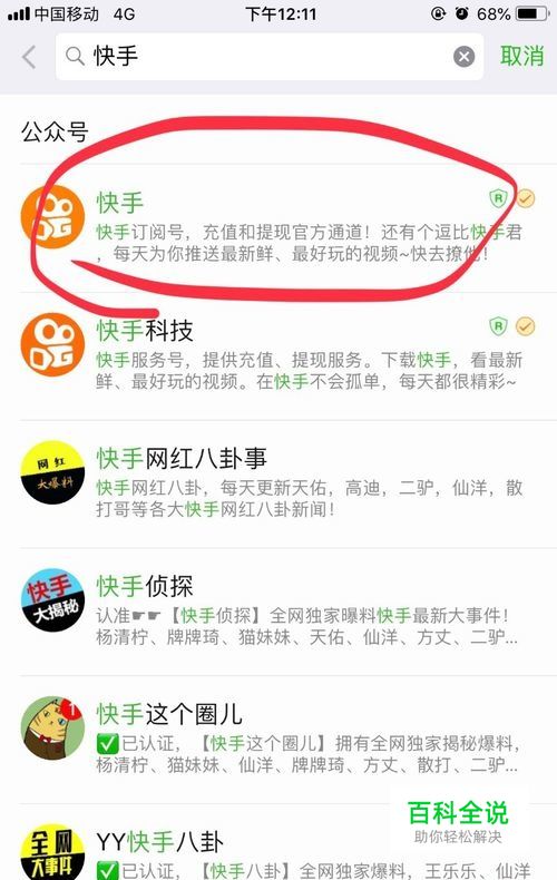 点击公众号,搜索“快手”并关注“快手”公众号