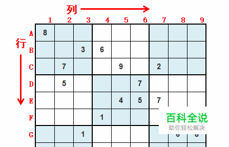 我们先来认识下九宫格的结构和名称,因为在玩这个游戏或者是看一些游戏说明的时候会经常用到这些名称。九宫格的列一般用数字123……进行表示,而行则用ABC……表示,这样来命名的目的是方便区分每一个格子。