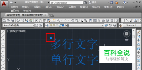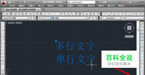 点击这个多行文字,可以看到只有一个“点击”,说明两行字是一个对象。下面将它分解成单行文字。