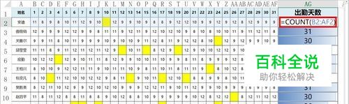 COUNT函数:计算包含数值的单元格个数。 下图中的例子是使用COUNT计算出勤天数,如果出勤了,就会有出勤时间(小时数是数值),未出勤则没有。