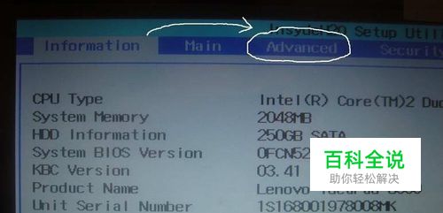 以联想笔记本电脑为例:开机---按F2进入BIOS(注意:有些电脑进入BIOS是其它的按键,在刚开机的时候下方会有提示,根据提示的按键按住即可进入BIOS),进入BIOS后,可按左右上下键调整选项,然后选中Advanced,如下图所示: