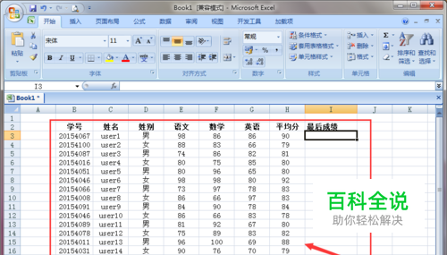 首先打开EXCEL2007软件,打开自己准备好的学生成绩表。如图