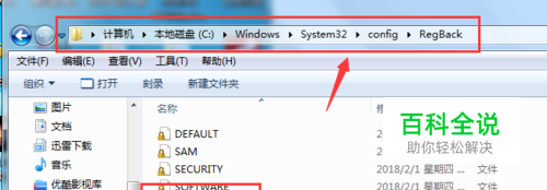 这样就可以启动PE系统,对系统文件进行管理,找到原win系统所在盘符,找到下图所示路径,首先找到系统盘符下Windows,最终找到RegBack文件夹,该文件夹为注册表备份文件所在位置。