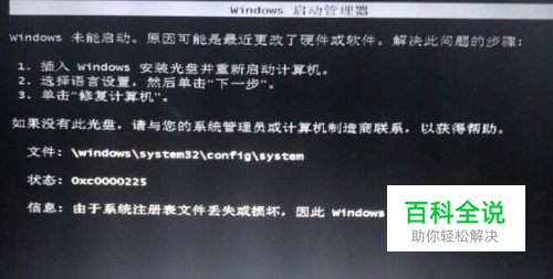 有时电脑开机过程中,按电源键强制关机,或者突然停电等导致电脑异常关机,会导致windows系统注册表文件丢失或损坏。当注册表文件出现问题后,开机过程会提示系统未能启动,并提供两种解决办法,一是用修复光盘启动系统,进行自动修复,二是没有光盘,则要联系厂家。同时在界面下方,有错误状态,这里为0xc0000225(也可能是其他)。这里介绍没有修复光盘情况下,如何不重装电脑系统,修复因注册表错误,系统不能加载启动的问题。