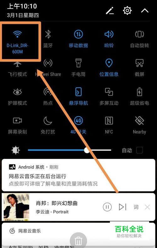 此时在界面上方出现功能菜单,按住箭头指向的wifi标志,是按住不是点按,点按就会断开wifi连接,如下图所示。