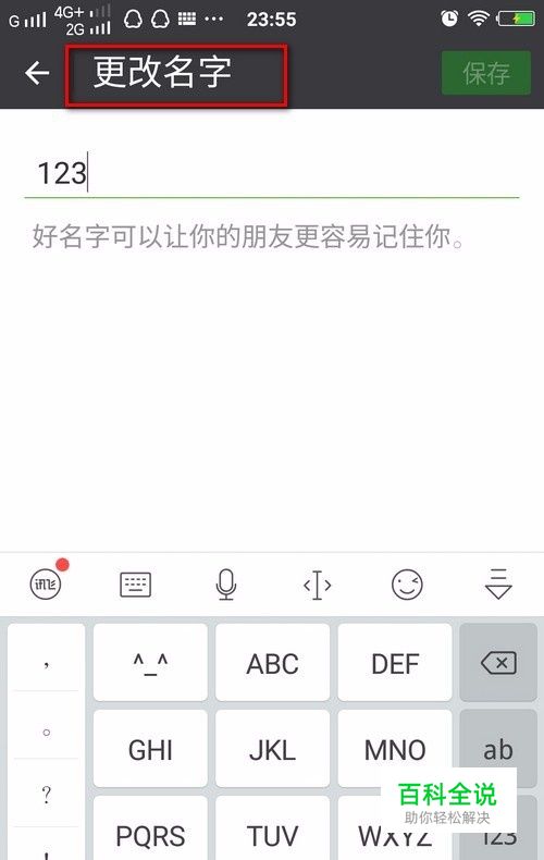 在对话框内输入新的微信名称,示例原微信名为123,更改后的微信名为456。更改好之后,点击保存。