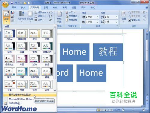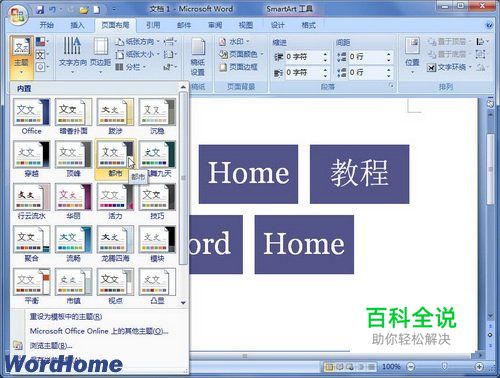 用户如果希望一次性修改当前Word2007文档中所有SmartArt图形的主题效果,可以在Word2007文档窗口“页面布局”功能区进行操作,具体步骤如下所述: