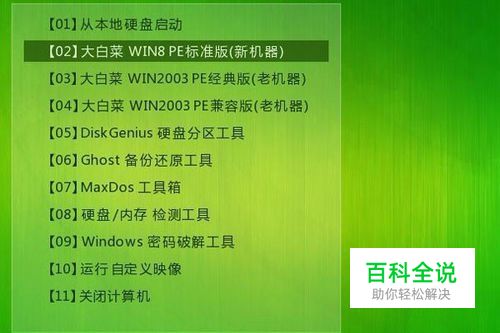 将制作好的大白菜u盘启动盘插入电脑,重启,按快捷键引导u盘进入大白菜,选择第二项win8pe系统进入,如下图所示:http://www.bigbaicai.com/rjjc/syjc/3425.html