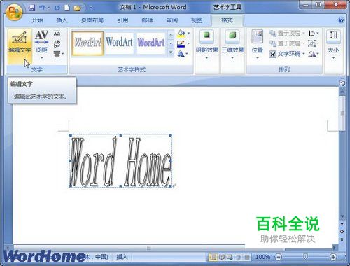 在Word2007文档中插入艺术字后,可以根据需要编辑艺术字文字及格式,操作步骤如下所述: