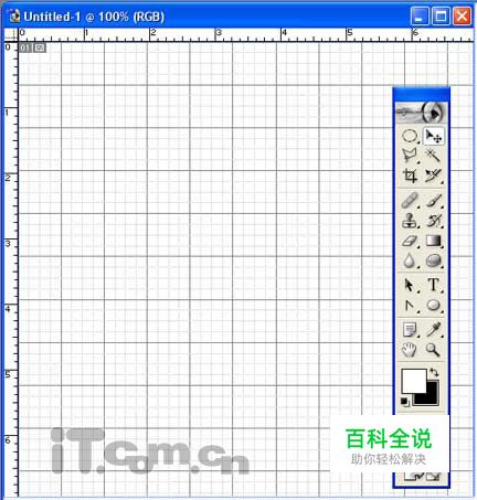 首先创建一个500*500,颜色模式为RGB的新文档,按下D快捷键恢复前景色和背景色的默认设置,关按下X交换前景色和背景色,然后按下Ctrl+R快捷键,打开标尺栏,按下Ctrl+'打开网格,如图所示。