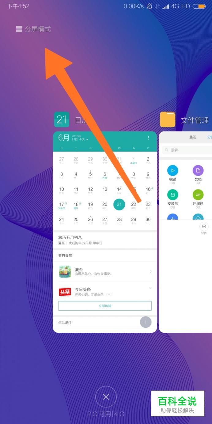 首先从手机桌面底部上滑,呼出多任务界面。然后点击进入左上角的“分屏模式”。