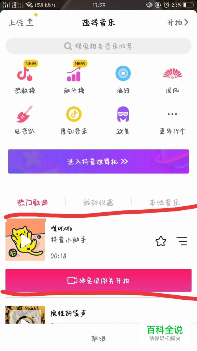 在页面中,选择一段喜欢的音乐,点击“确定使用并开拍”。