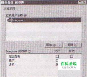 单击【权限】按钮,在弹出的对话框 中的【组或用户名称】列表框中先删除Everyone 用户组。再单击【添加】按钮,效果如图(2)所示。