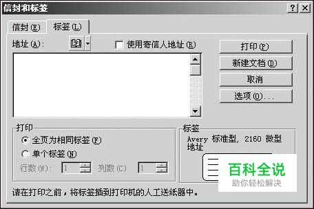 制作十张名片的定位框 新建一个文档,依次点击“文件→页面设置”菜单项,在弹出的对话框中设置“纸型”选项卡中的“纸型”项为“自定义大小”,其中的“宽度”为 19.5cm;高度为29.7cm。接着依次点击“工具→信函与标签”菜单项,在弹出的对话框中点击“标签”选项卡中的“选项”按钮(如图2所示)。 在随即进入的对话框中,设置“标签产品”为“Avery A4和A5幅面”,“产品编号”为“L7413名片”,设置完毕完点击“确定”按钮返回上一步。 返回到上一步后点击“新建文档”按钮。这样在Word中就出现了十个相同大小的框。