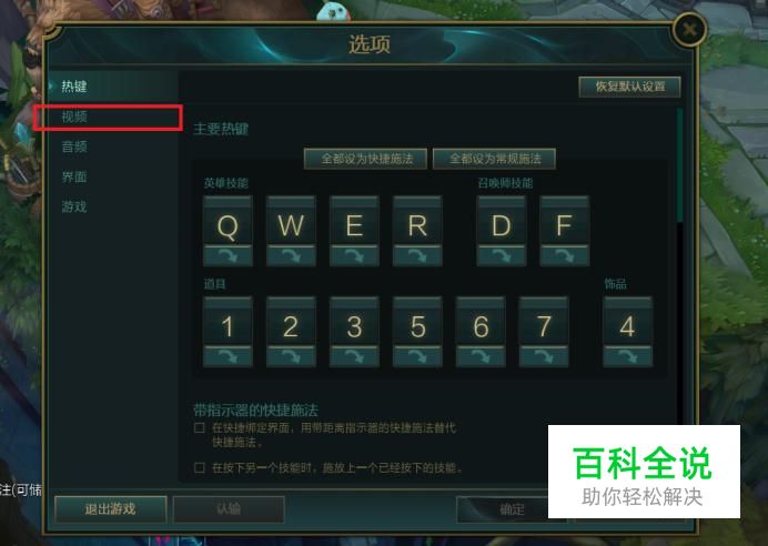 首先,应该明白的是,LOL游戏支持的最大分辨率取决于你的电脑屏幕所支持的最大分辨率,一般情况下,游戏分辨率是和系统界面保持一致的。打开LOL游戏之后,按下Esc键,在弹出的对话款中,选择“视频”菜单选项。
