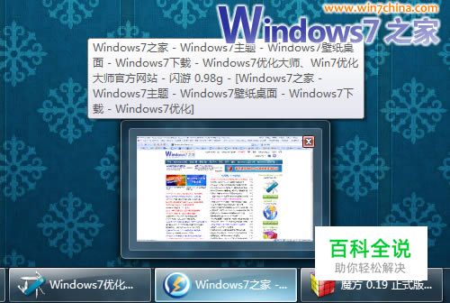 窗口预览 在Vista中,当将鼠标置于任务栏的图标上时,将会出现一个窗口预览。Win7中也有类似的预览,只不过Windows 7所提供的是一个全尺寸的窗口预览,您可以直接通过缩略图去关闭窗口。同时,您还可以通过按住Win + T快捷键去滚动任务栏预览。示例如下图中鼠标放到任务栏闪游浏览器时候的预览窗口出现: 任务栏上预览图片等