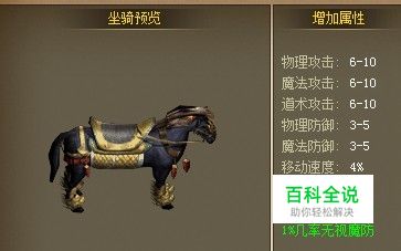 坐骑是武尊玩家的好伙伴,除了在赶路的时候增加移动速度之外,还可以为人物增加各种属性,下面我们就来给大家介绍一下各等级坐骑的炫酷外型和霸气属性。 这是第一阶的坐骑,由于是坐骑的初始属性,因此外型不酷炫,属性也不霸气,不过没有关系,我们可以使用坐骑经验丹或者元宝进行提升。 坐骑提升的品阶越高,给予人物的属性加成也越多,升级到最高阶带给人物的属性加成可以用恐怖二字来形容。 当然坐骑想要提升也没有想象的容易,坐骑经验丹可以通过副本或者寻宝来获得,如果有条件的玩家,则直接使用元宝吧,方便快捷,可以使用300元宝一次的提升方法,也可以使用一键提升的方法,选择哪一种,当然是看自身的情况而定了。