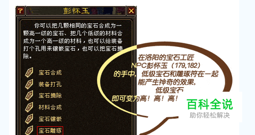 通过洛阳(177,184)的NPC宝石工匠彭怀玉对话,选择“宝石雕琢”进入宝石雕琢功能界面,将宝石与雕琢符及需要雕琢的宝石拖入界面中即可实现功能。