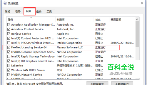 弹出的系统配置里面选服务,找到flexnet licensing sevice 64服务项目在前面方框选中。(如果服务太多不好查找可以左下角隐藏所有Microsoft服务。)确定。
