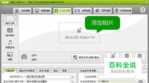 添加相片,利用文字特效为电子相册添加文字说明 点击“添加相片”按钮,将照片一次性导入软件,通过鼠标点击拖拽相片,调整相片的播放顺序。点击“修改名字/注释/旁白”按钮,利用文字特效功能,为相片添加名字、注释字幕,向大家介绍你的电子相册。