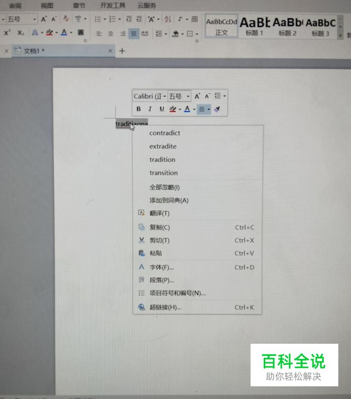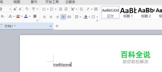 在word文档中,如果英文字母下方出现波浪红线,一般属于单词的拼写错误,文档自动标出,在此我们以“traditional"为例。