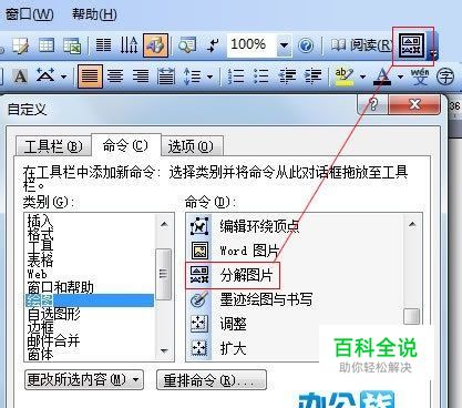 在自定义界面中切换到命令一栏,类别选择绘图,在命令中找到分解图片,鼠标将此按钮拖放到菜单栏中。