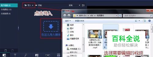 进入到软件界面中点击“导入”或者点“在这儿导入媒体”在打开窗口中选择需要进行编辑的视频文件,点击“打开”。