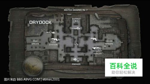 DrydockCommand Posts: 4 (North, South, West, and East) 特殊武器: Scorcher (Security Trailer), Torque (Anchor) 手枪: 2 Boltok (Pump Station and west of Cargo Spawn) 手榴弹:油墨手榴弹 (Pump Station), 燃烧弹(Center of map lower level) 重型武器: 重型狙击枪(Banner)