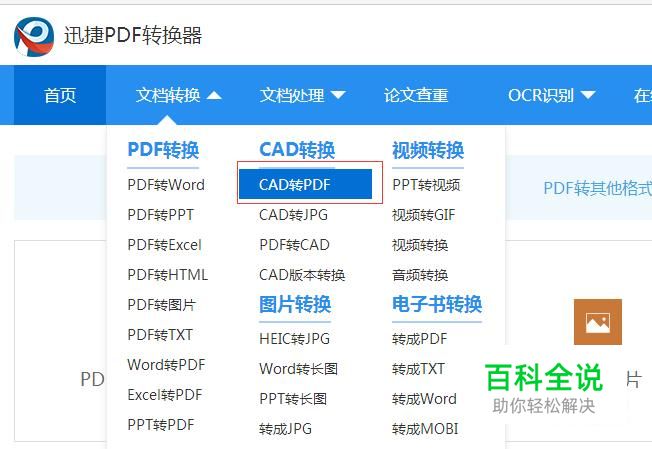 在7个栏目功能中找到文档转换下的CAD转换并点击CAD转PDF