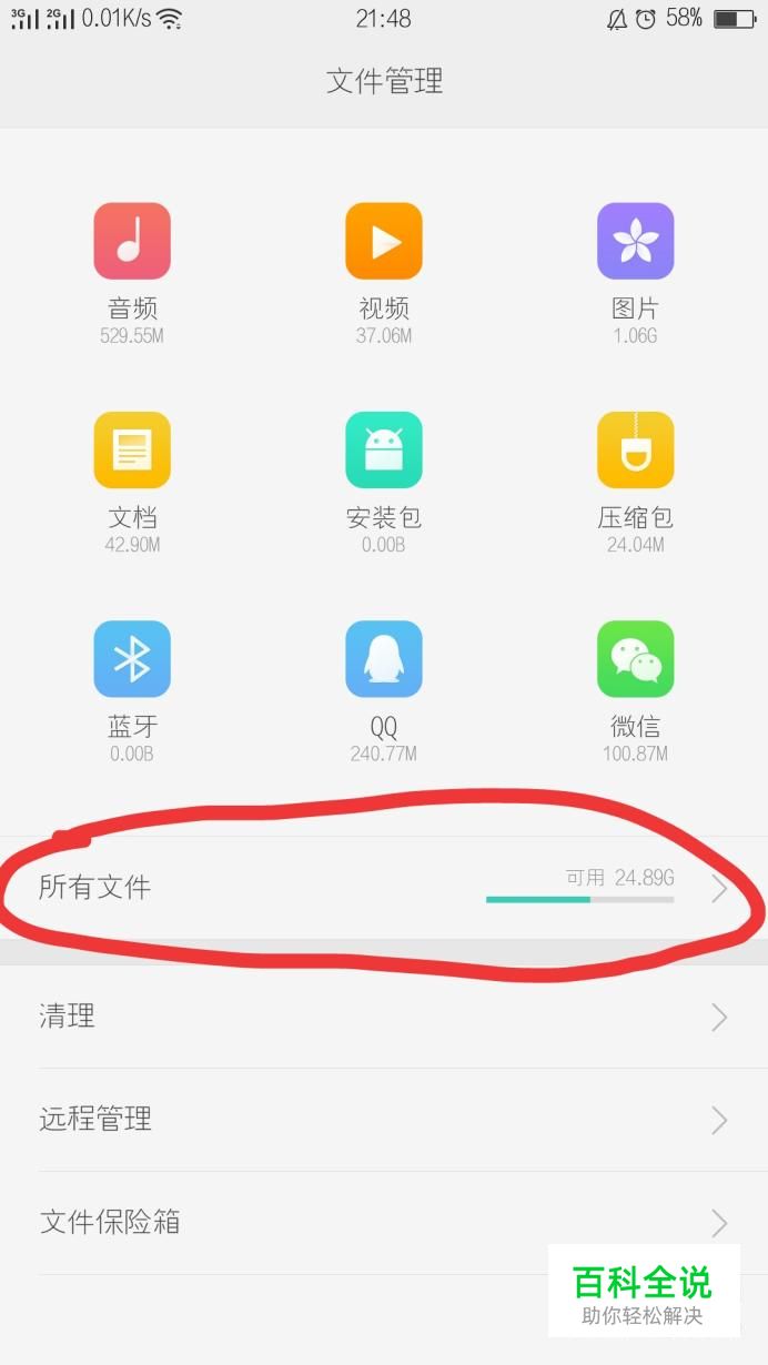 打开文件管理之后,点击所有文件,如下图红色标注的内容所示。
