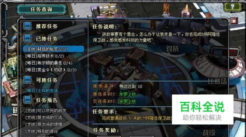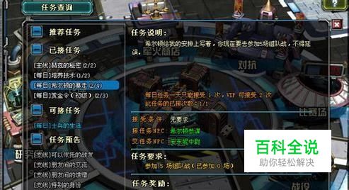 任务界面认真看 想必有不少玩家做任务心切,只管一个劲地接任务。见了“接受任务”就点,也不管任务的具体要求是什么。坦克里的任务大都是打战役,于是不少玩家在一开始就去战役里胡乱打一通,末了发现任务还是没完成,因为任务里要求打甲战役,而玩家打的是乙战役!为了避免这种吃力不讨好的事情,建议大家在做任务时要好好看看任务界面。 任务界面分为左右两大块,左边是任务列表,你可以了解到很多有用的任务信息。一共有推荐任务、已接任务、可接任务和任务预告四个大项。每项下又都有具体的任务名称。这是系统根据你所在的等级提供的相关任务信息,要好好看看。 右边则是每个任务的具体注解。点击左边的白色字体的任务名称,右边便会出现具体的任务信息。有任务说明、接受条件、接交任务的NPC名字、任务要求和任务奖励。这些注解都十分详细。 最重要的是要好好看任务要求,了解了之后按照要求去做就好了。而如果是找人的任务,不管要找哪个NPC,只要点“完成任务”的选项框就能找到了。这样接什么任务做什么事,一目了然,不会再出现混乱。