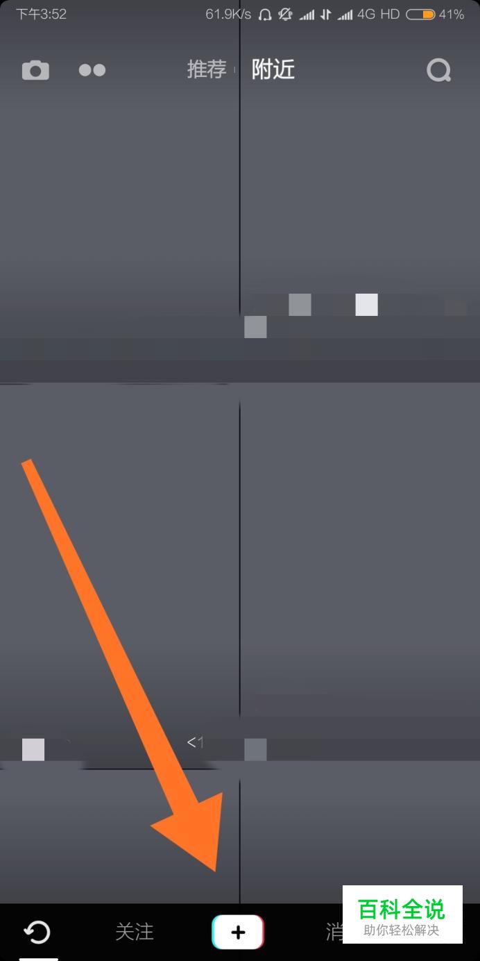 首先我们进入抖音的首页,点击屏幕下方的“+”号。