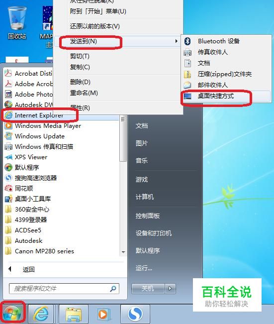 第一种方法,查看全部开始菜单,如果正常安装的话应该在菜单中可以找到IE程序,右键点击IE,在弹出菜单中选择“发送到”,在扩展菜单中选择“桌面快捷方式”就可以了。另外,鼠标点住直接拖动到桌面也是可以的。