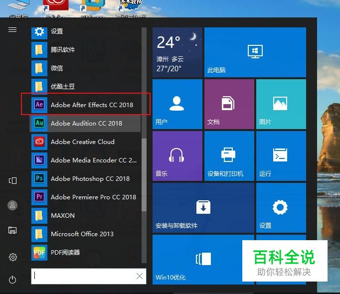 在开始程序中找到 Adobe After Effects CC2018,点击左键,启动软件。