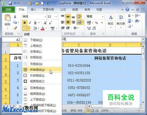 1.在Excel2010“开始”功能区设置边框 “开始”功能区“字体”分组的“边框”列表中,为用户提供了13种最常用的边框类型,用户可以在这个边框列表中找到合适的边框,操作步骤如下所述: