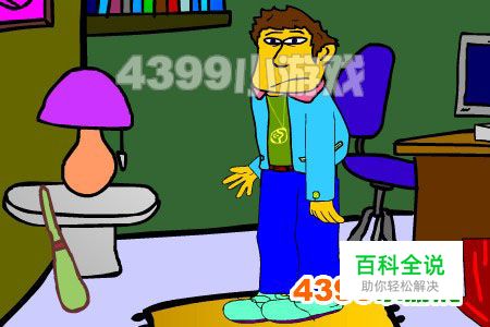 3、下楼,跟蓝衣服人对话,后进右边门,点墙上画,拿骷髅钥匙,再去左边的房子,拿骷髅钥匙开门,把地上插头插好,看到电脑已经开机,再点右下的拐杖。