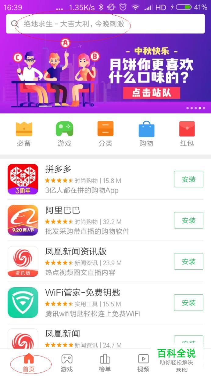 如图所示,唤出"应用商店"选项界面。选择下侧"首页"标签,点击上侧搜索文本框。