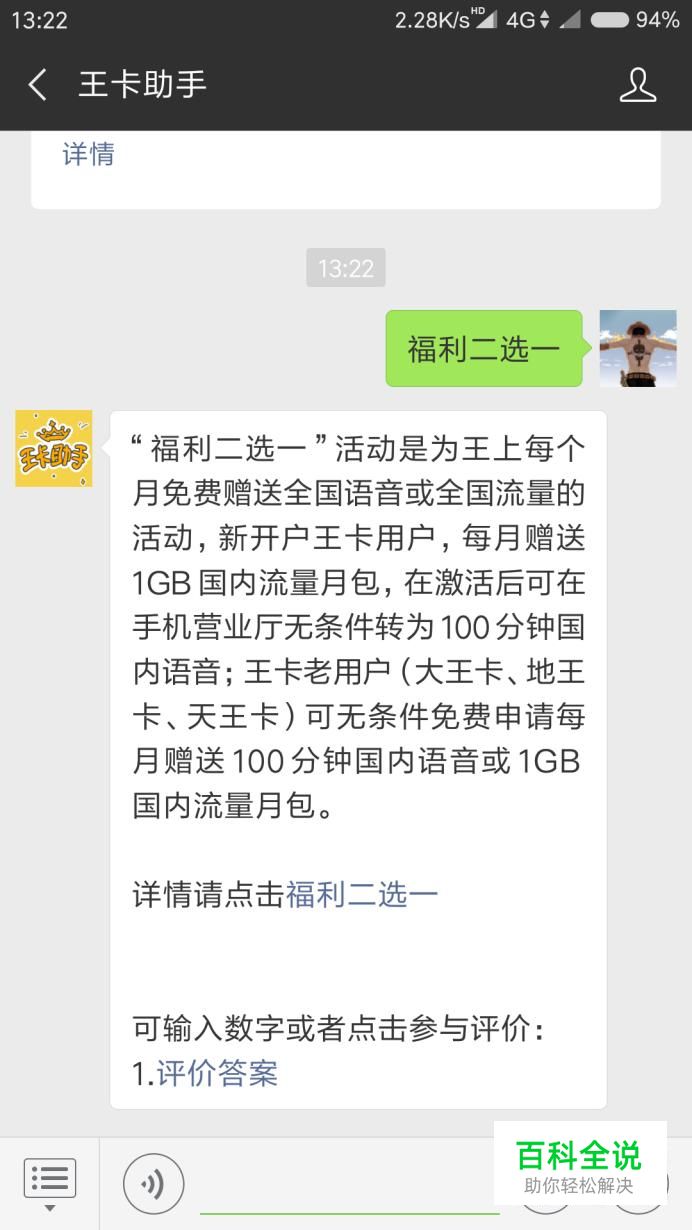 在微信搜索“王卡助手”并关注,然后进入对话框模式,输入“福利二选一”,点击发送回来的蓝色超链接。