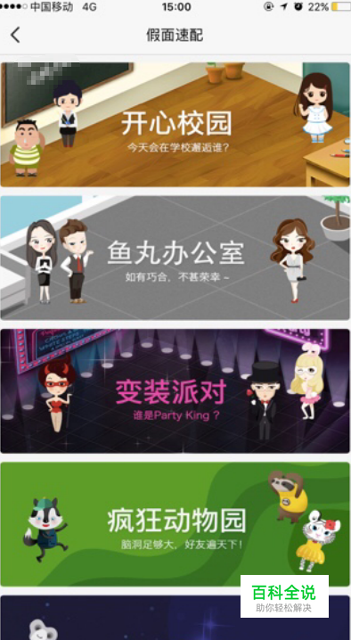 打开软件,进入”发现”页面,点击[假面速配]选择自己喜欢的场景,即可进入多人速配状态! 多种不同的场景,开心校园、鱼丸办公室、变装派对、疯狂动物园、外星奇遇,视觉上就有很多的体验!除此之外,有很多的角色可以体验哦!不同的场景厘米啊吧角色也各不相同! 比如:开心校园里的体育老师、鱼丸办公室的小秘书等。