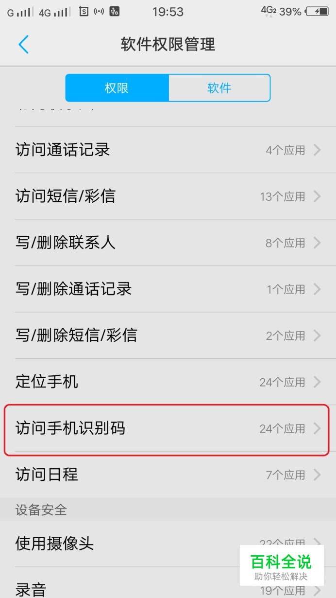 接着,点击“软件权限管理”,在其中找到“访问手机识别码”。